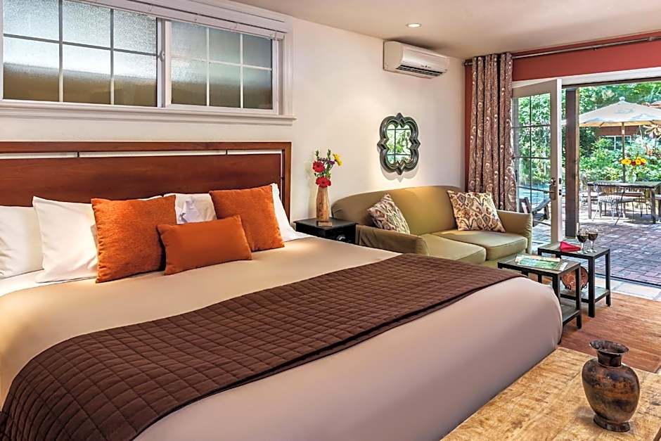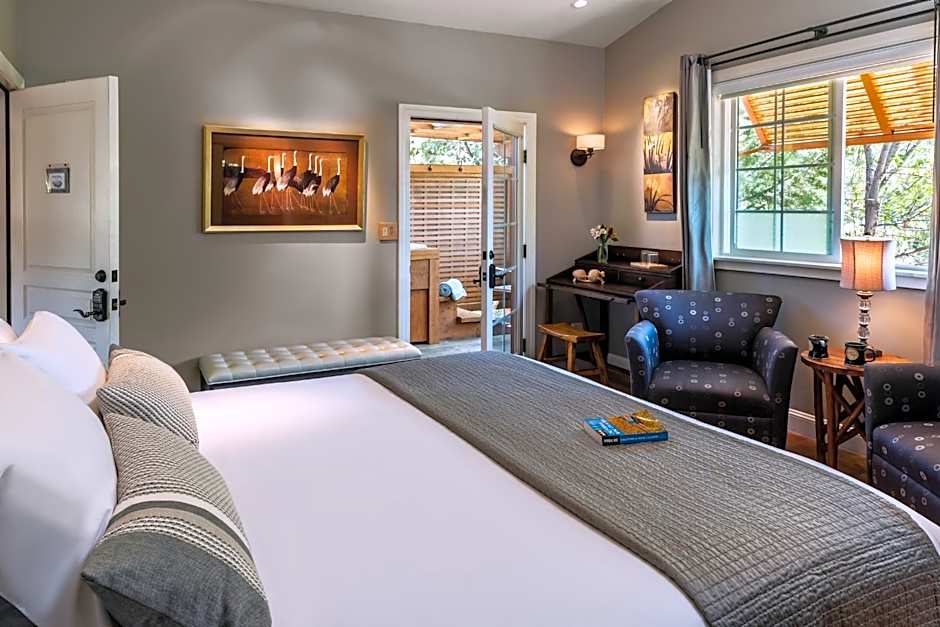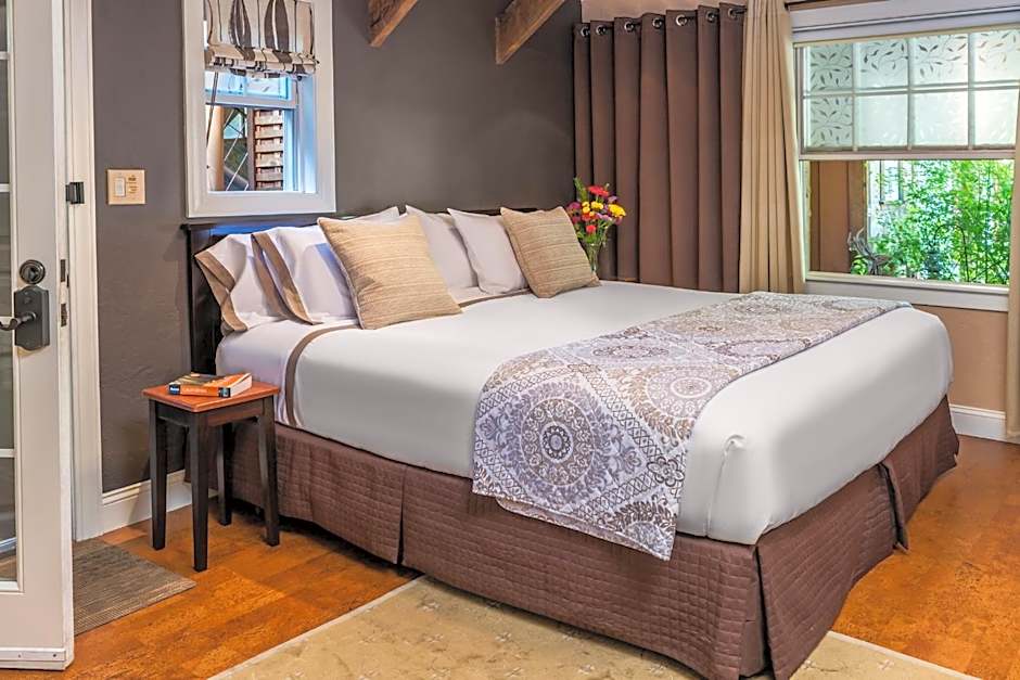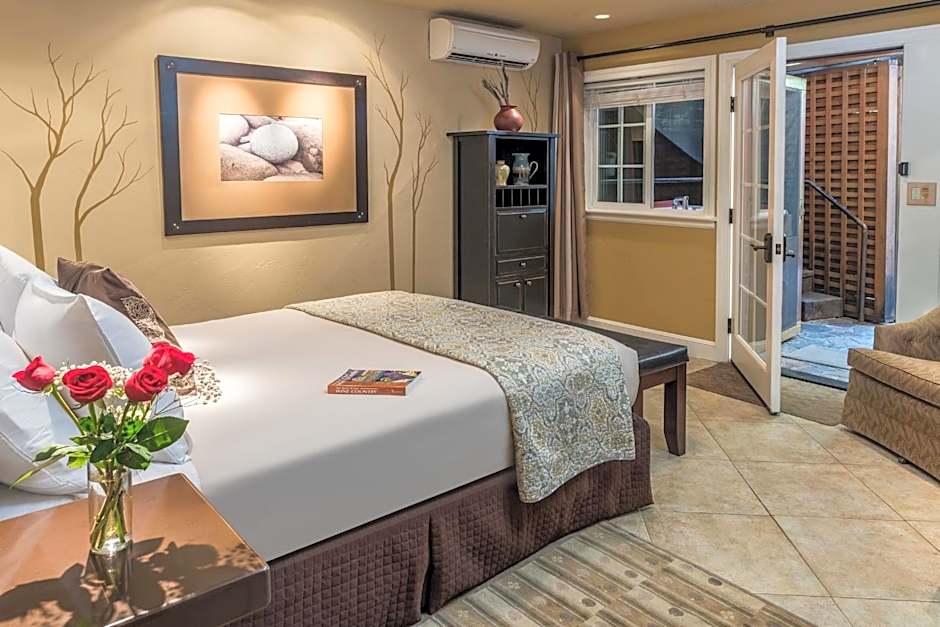 Also known as the Stone Pine Room, this pet-friendly room features a 2-person deep-soaking spa tub on a private patio that leads to the garden. This room also offers a fireplace, an HDTV and DVD player, WiFi, breakfast and ambiance computer lighting.