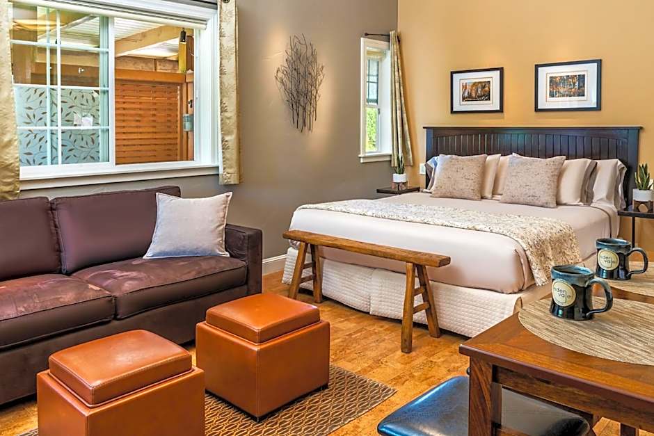 Also known as the "Cottonwood Room", this pet-friendly room features a garden patio with a table, 4 chairs and a 2-person soaking bath. There is also a flat-screen TV with a DVD player, a fireplace and a sofa bed, which is available for a fee.